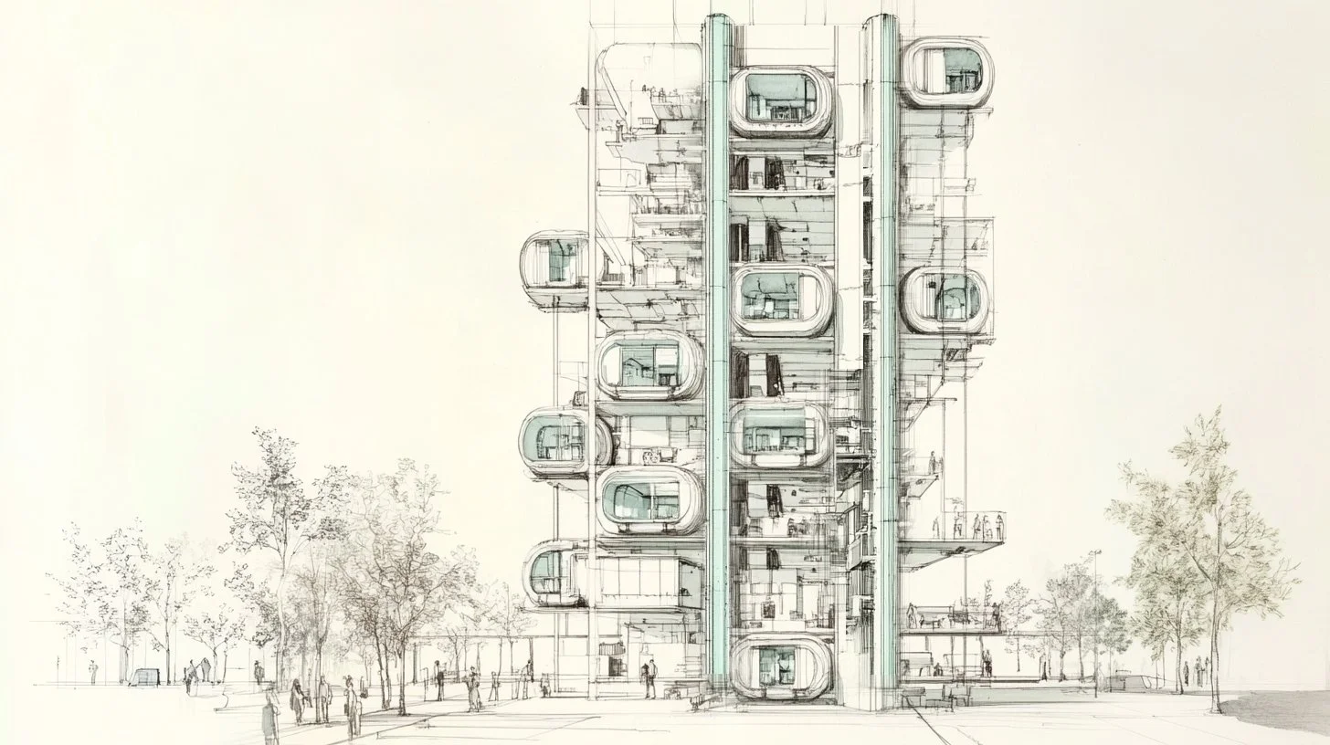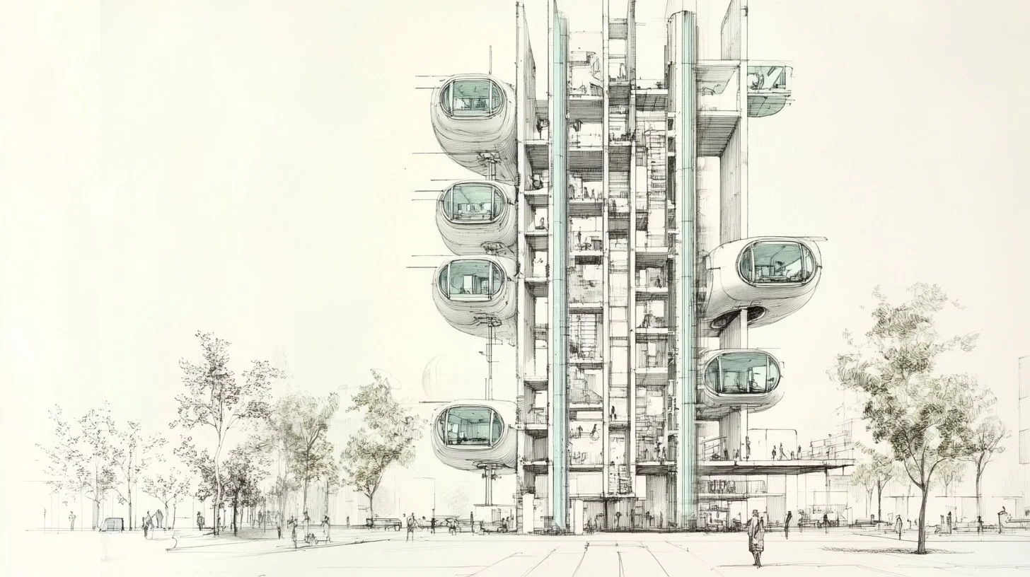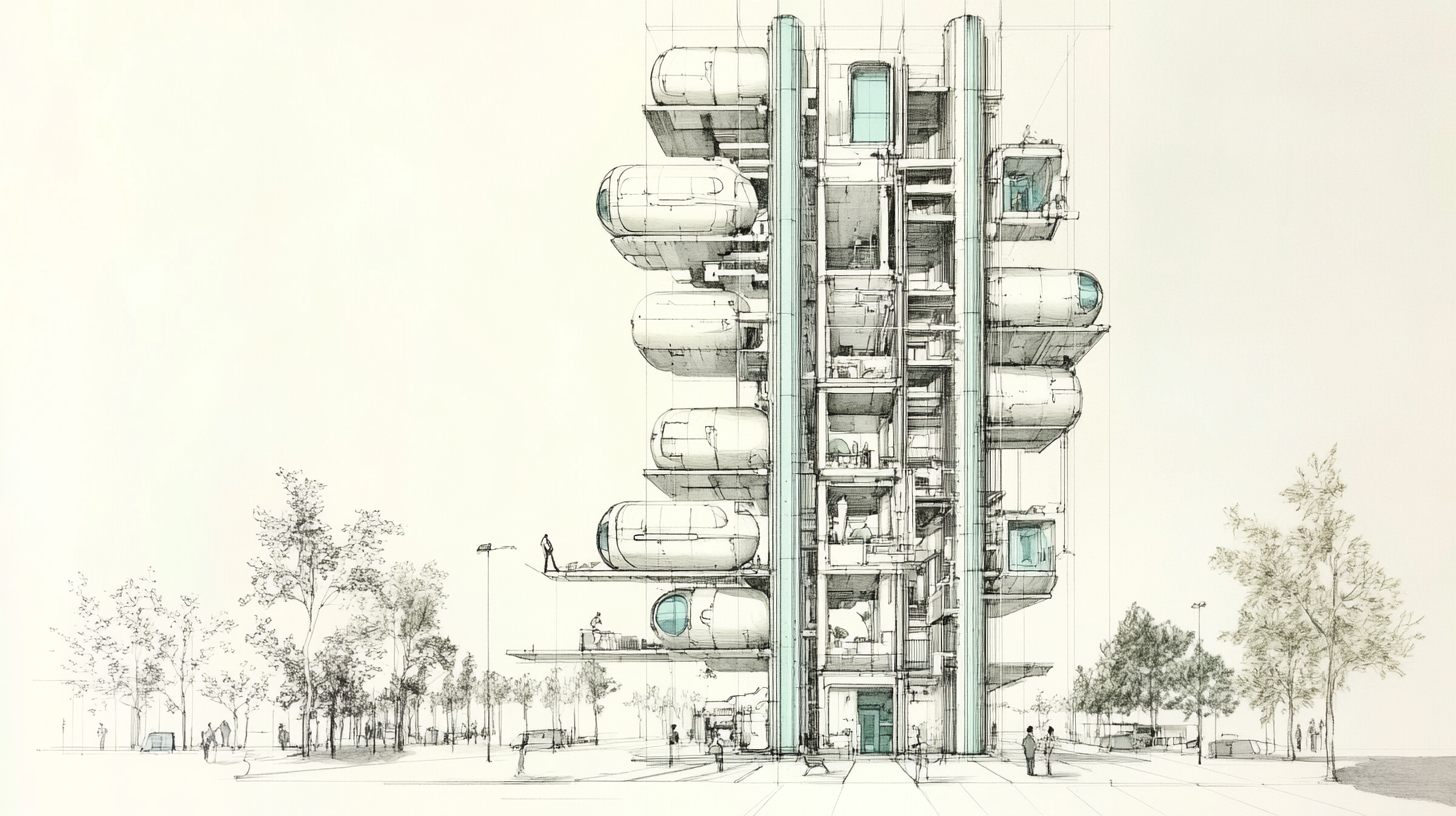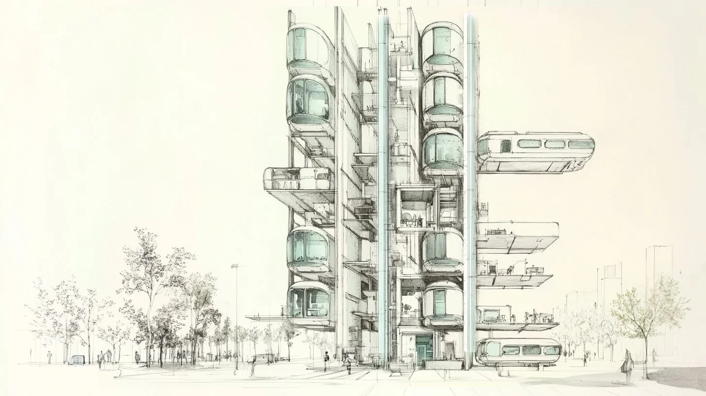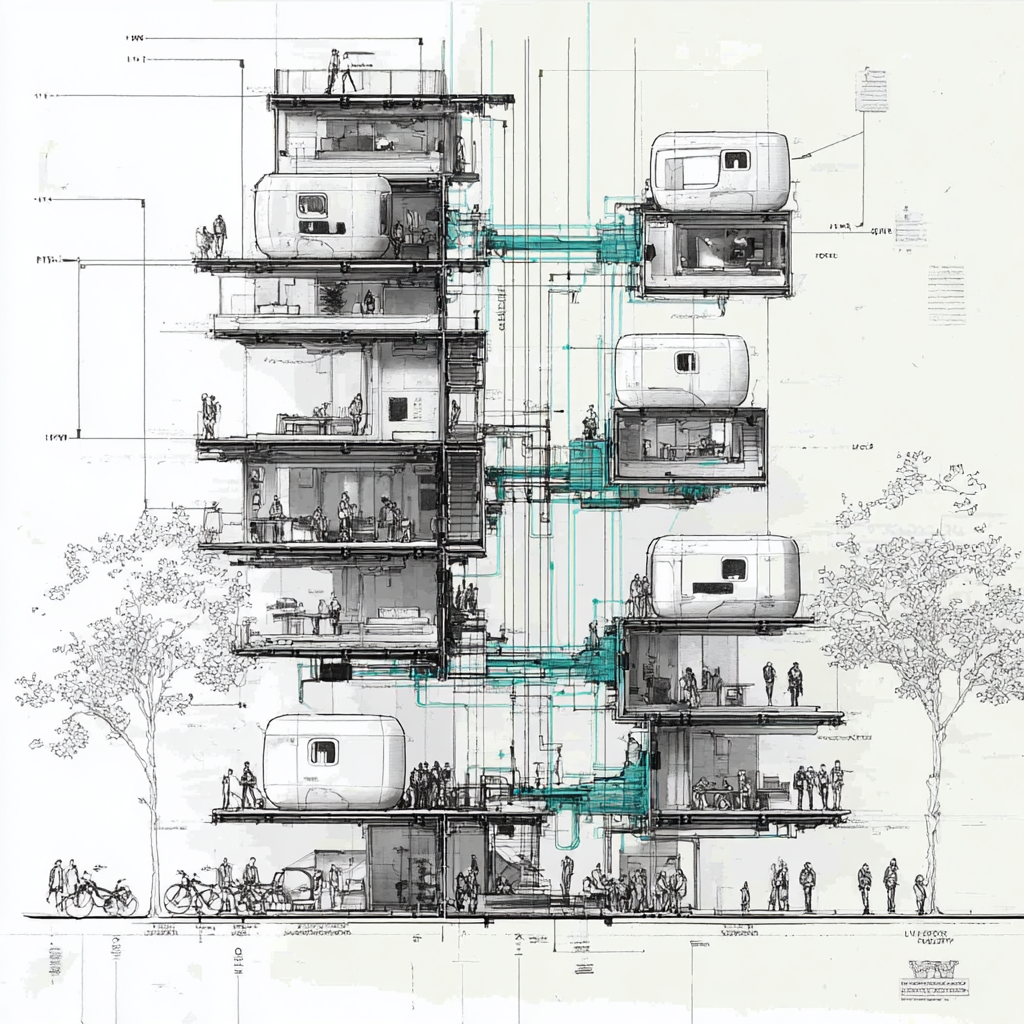 The Docking Hub. A multi-story building designed to receive, service, and stack pods. Not an apartment building—a mobility interface. The structure is permanent; the inhabitants are transient. Think parking garage meets hotel meets co-working space.